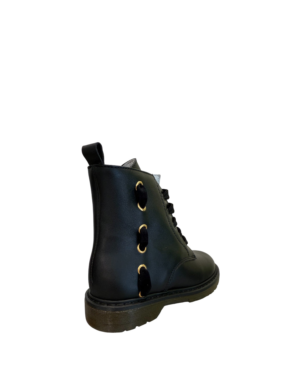 Anfibio in pelle nera con dettaglio laccio in velluto nero passante sulla parte lateraleanfi della calzatura.