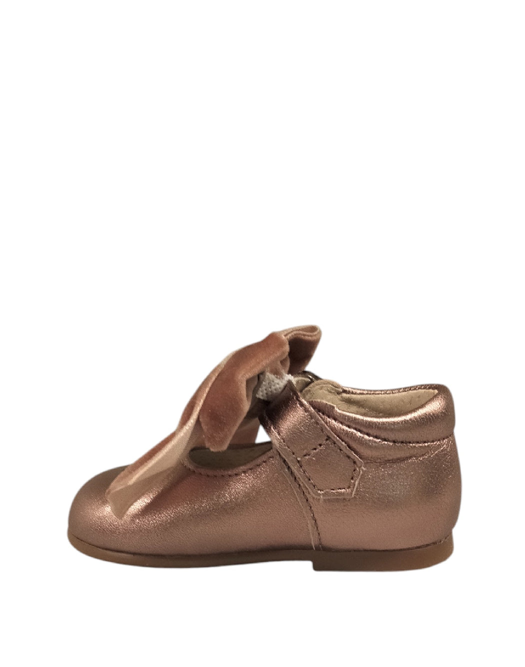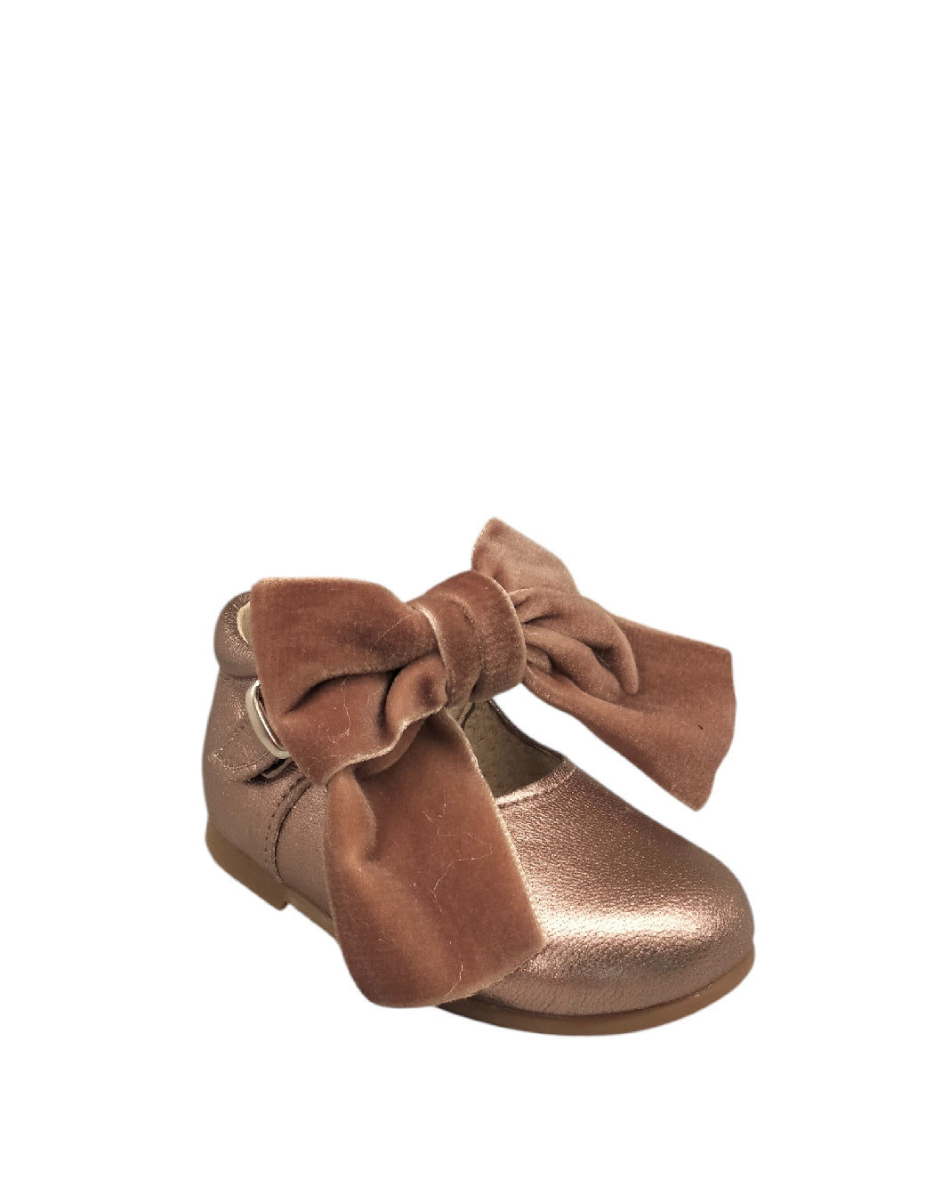 Ballerina color bronzo laminato con fiocco removibile in velluto in tinta. Fondo in gomma miele, interno in pelle. Tallone rinforzato ed ideale anche per muovere i primi passi. Chiusura con cinturino e fibbia.