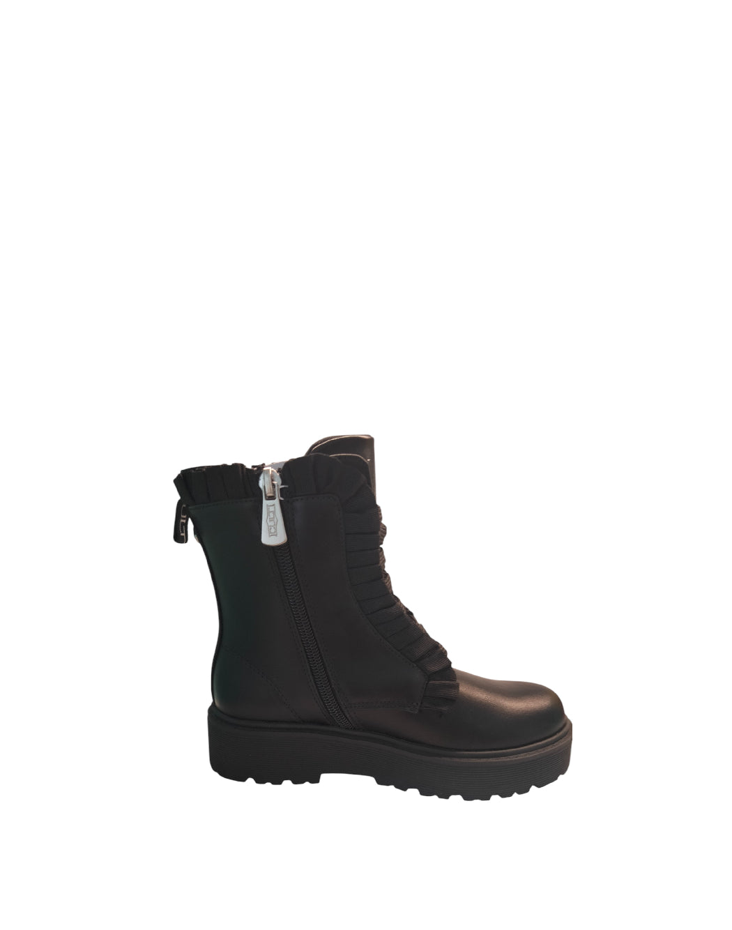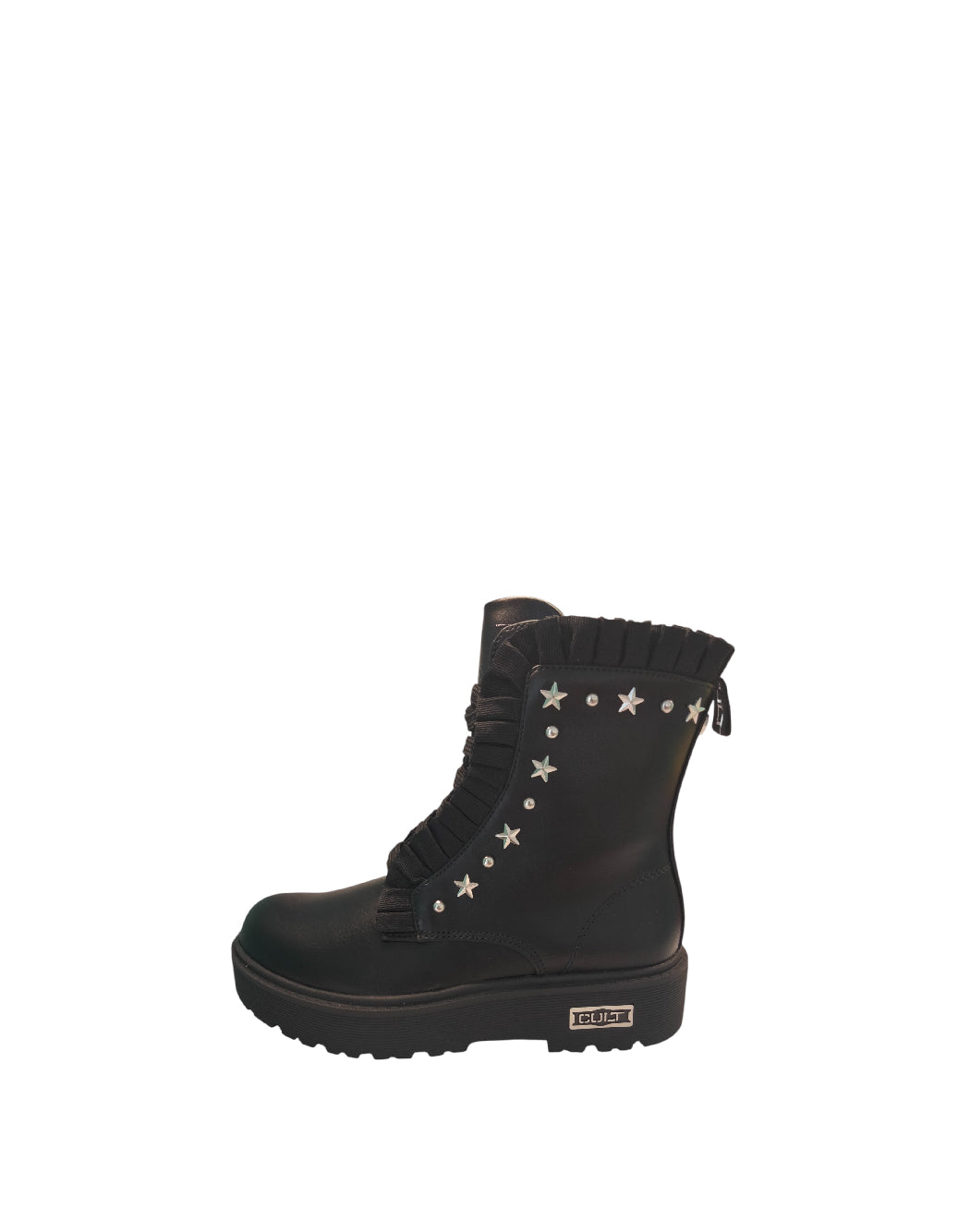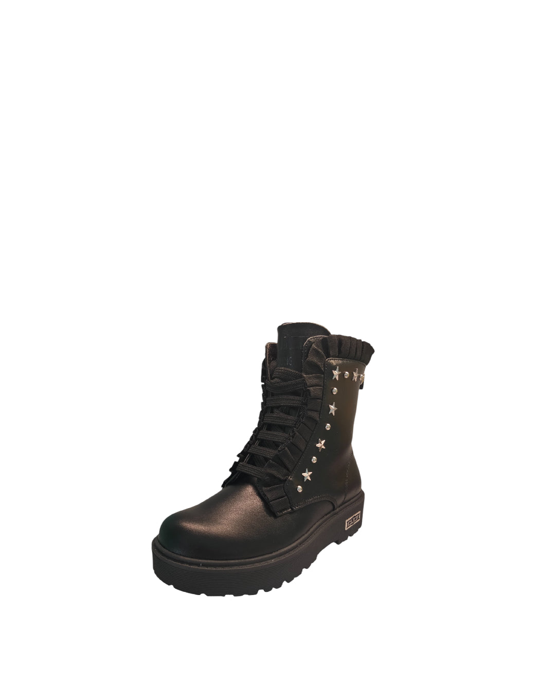 Anfibio da bimba/ragazza/mamma. Similpelle nero, chiusura con lacci e cerniera laterale. Sulla parte laterale dettaglio decorativo caratterizzato da piccole borchiette e stelle e contorno abbellito da ruoge in tinta.