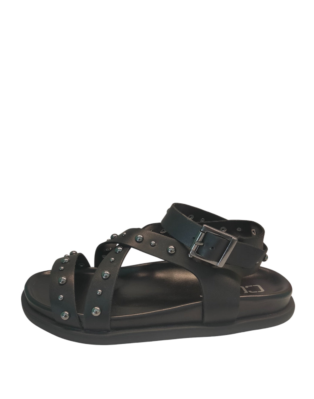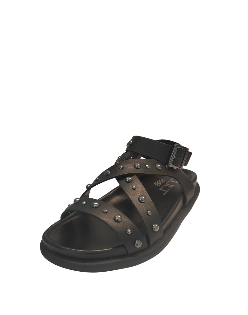 Sandalo da bimba/ragazza/mamma, con incrocio sul dorso del piede e chiusura con fibbia e cinturino alla caviglia. Sottopiede nero in tinta con il fondo e borchiette decorative sulla tomaia.