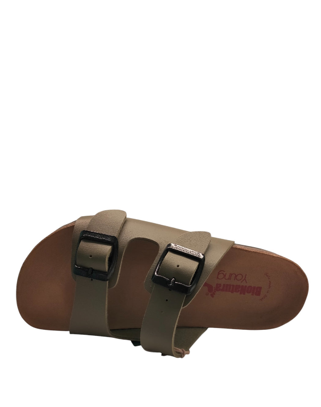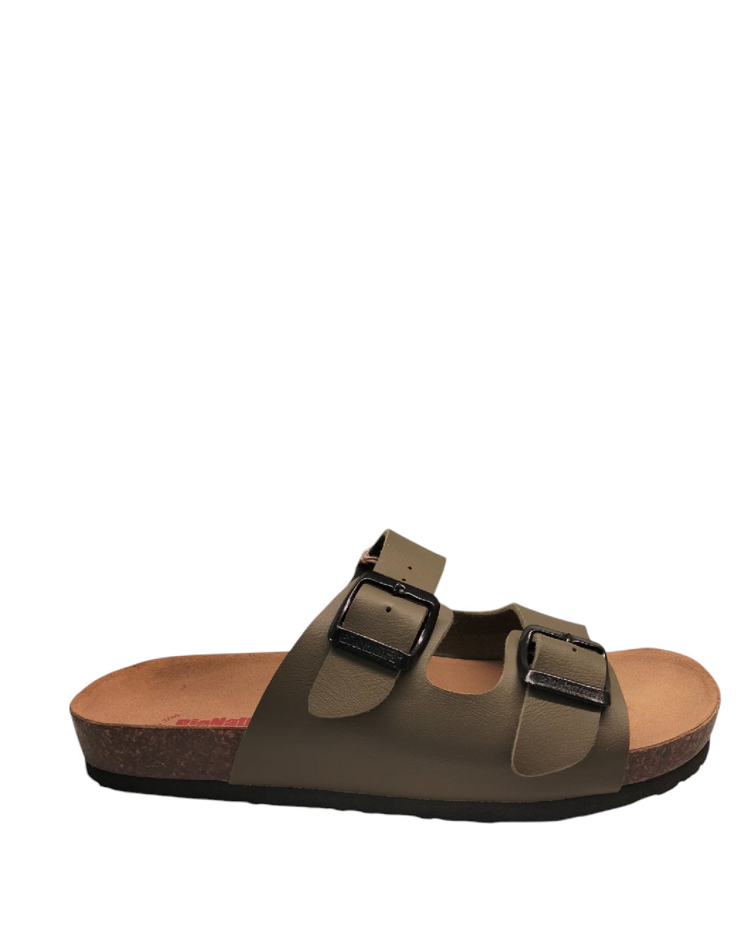 Ciabatta BIO bassa, tomaia in ecopelle tortora regolabile con doppia fibbia in metallo smaltato per resistere alla ruggine e al tempo, sottopiede in pelle, intersuola SoftSystem, scafo in gomma e sughero, suola in microporosa, materiale leggero flessibile. Qualità MADE IN ITALY.