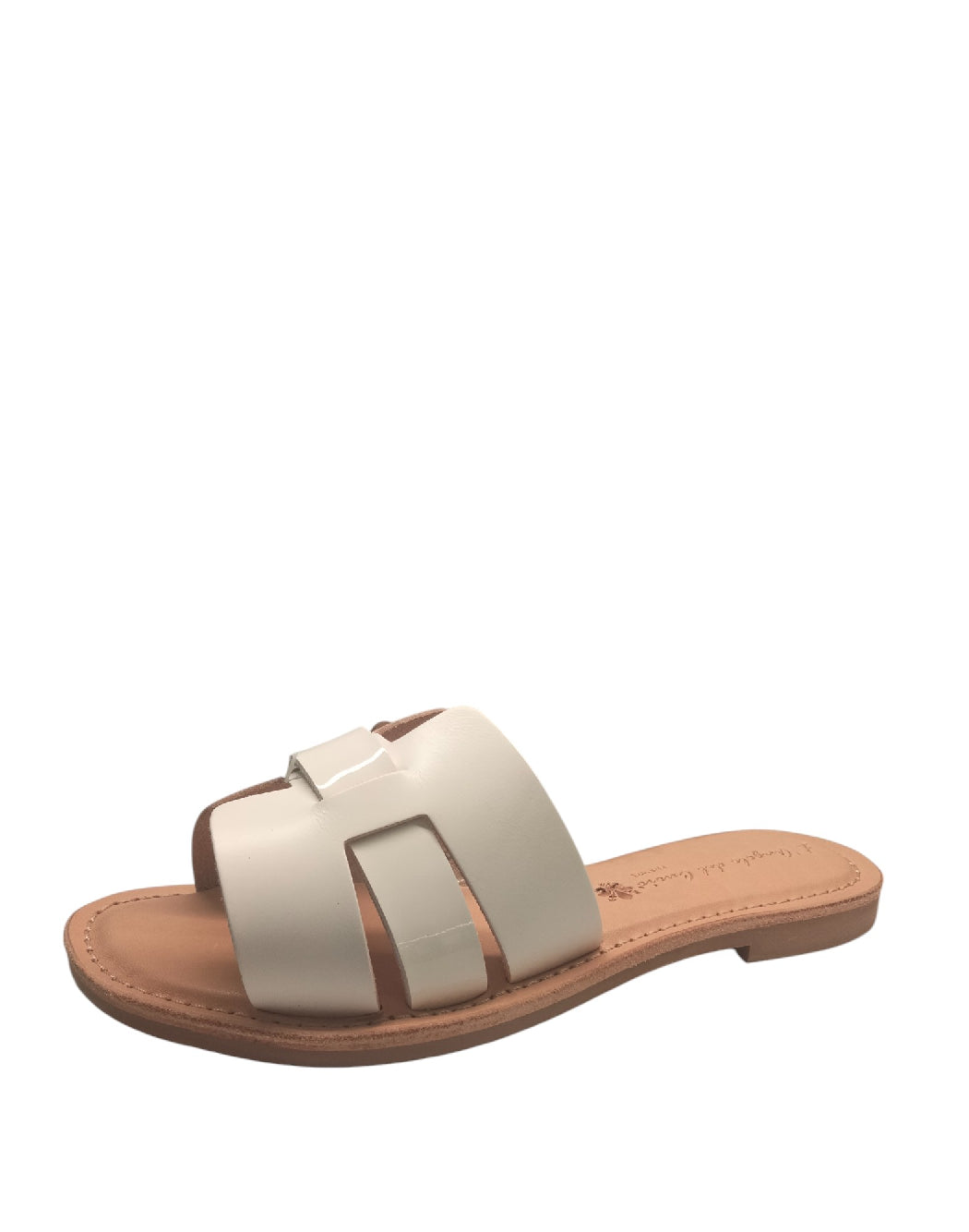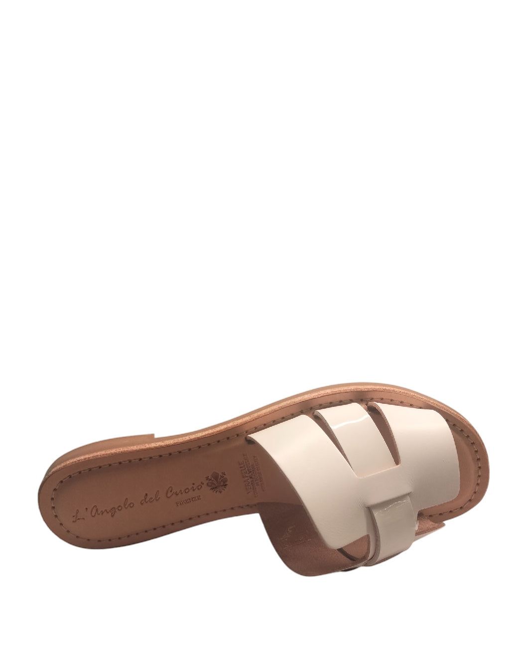Ciabattina per ragazze/mamme. Fascia unica con dettaglio intreccio in vernice bianca. Fatto a mano in Toscana,100% made in Italy. I migliori pellami utilizzati sono conciati al vegetale.