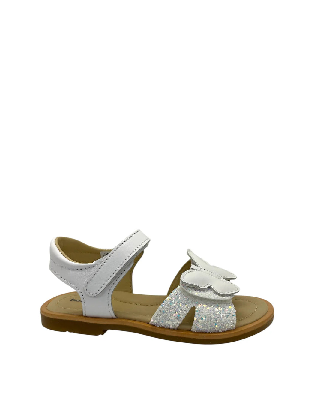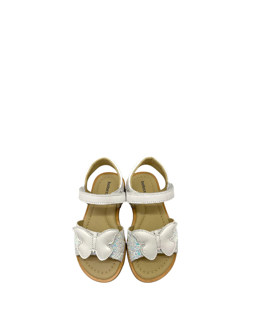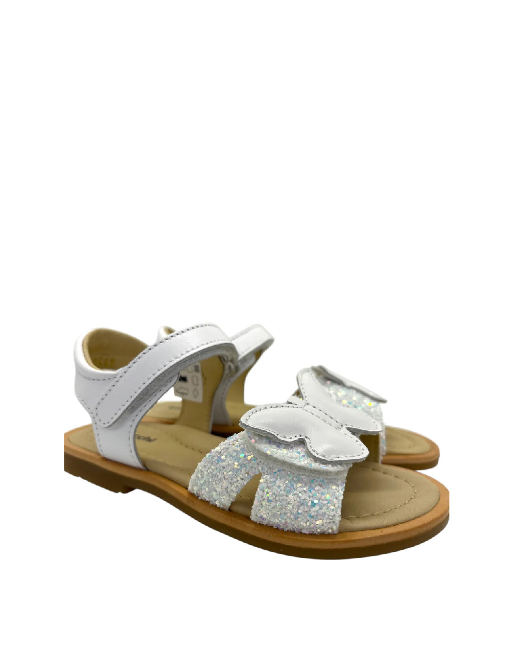 Dettaglio glitterato sulla parte laterale del sandalo e farfalla sulla parte superiore.