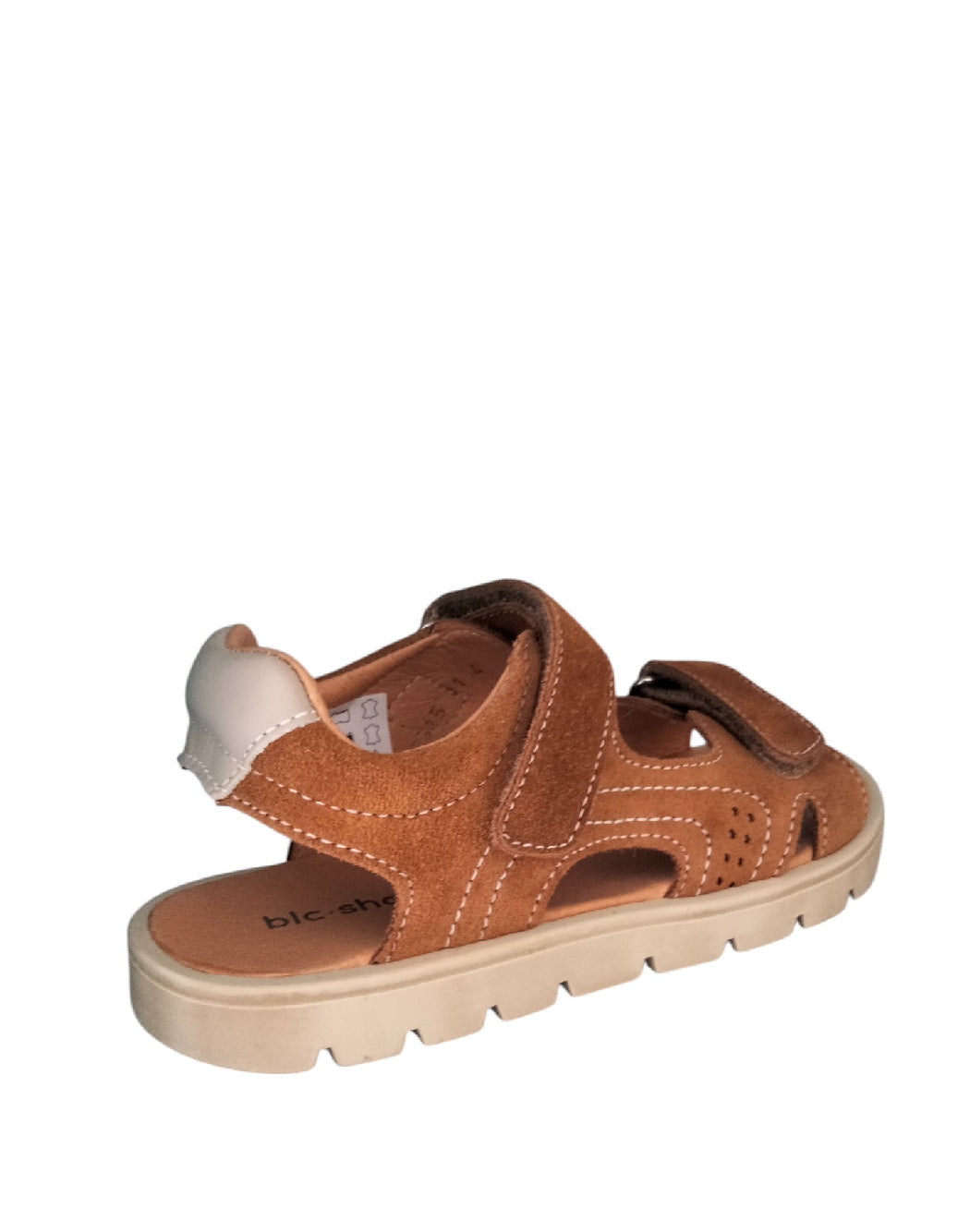 Sandalo da bambino. Chiusura comoda con strappi regolabili, tomaia in pelle color cuoio, fodera in pelle e sottopiede in pelle imbottito. Suola in gomma flessibile.
