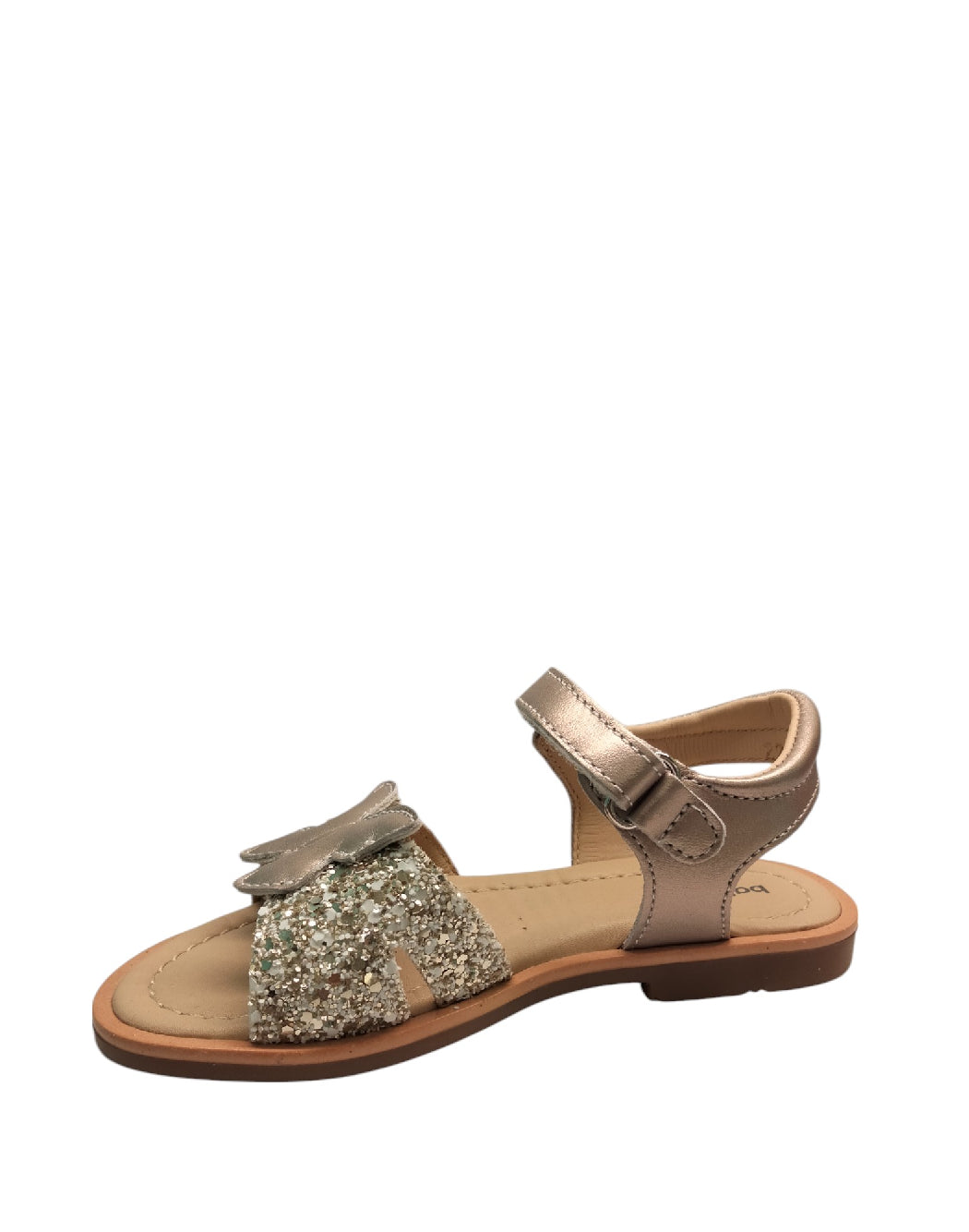 Dettaglio glitterato sulla parte laterale del sandalo e farfalla sulla parte superiore.