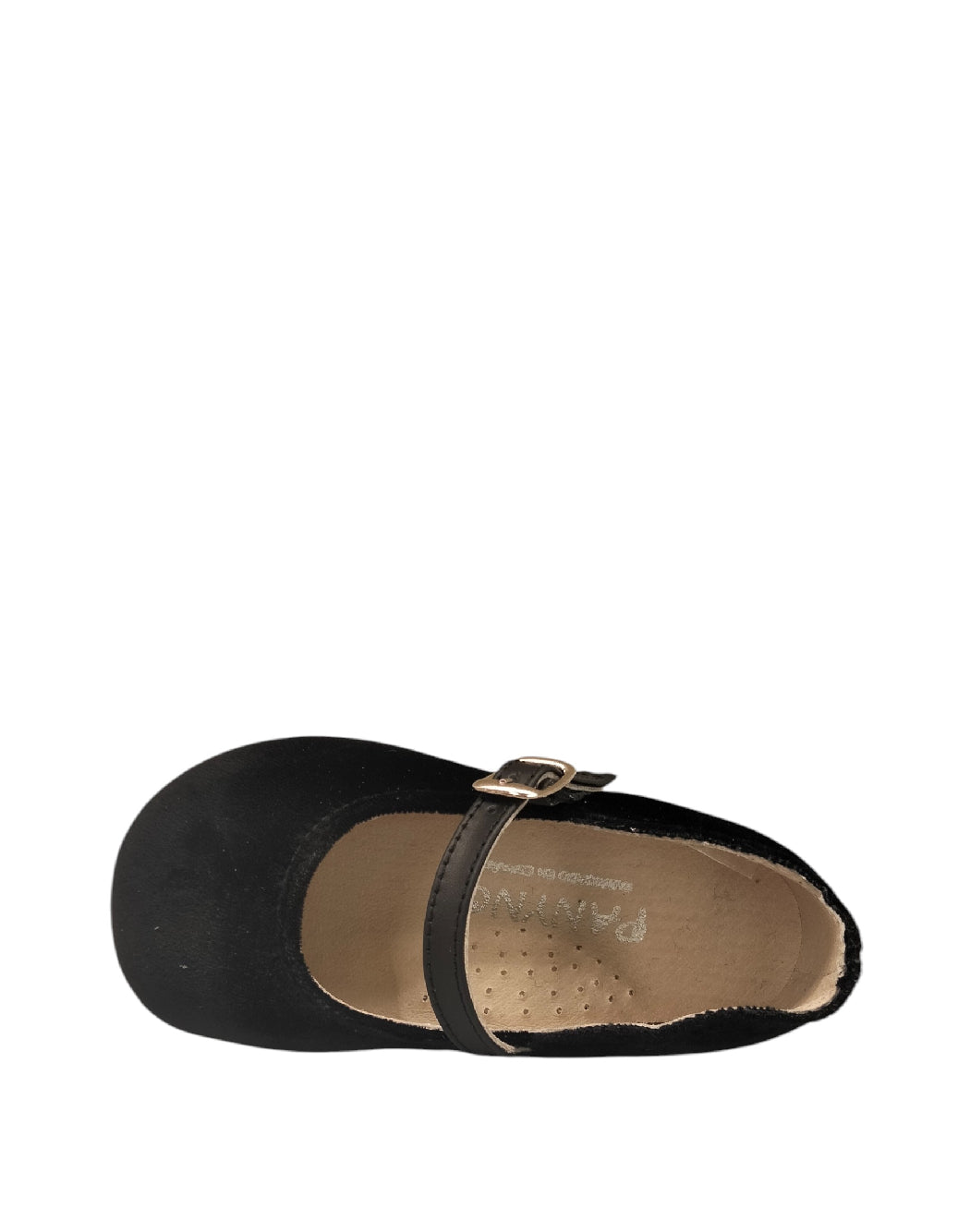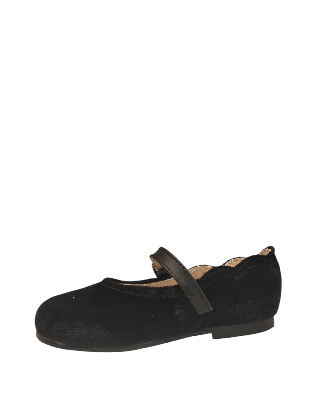 Ballerina in velluto nero con bordo smerlato. Chiusura con cinturino e fibbia. Fondo in gomma in tinta ed interno in pelle.