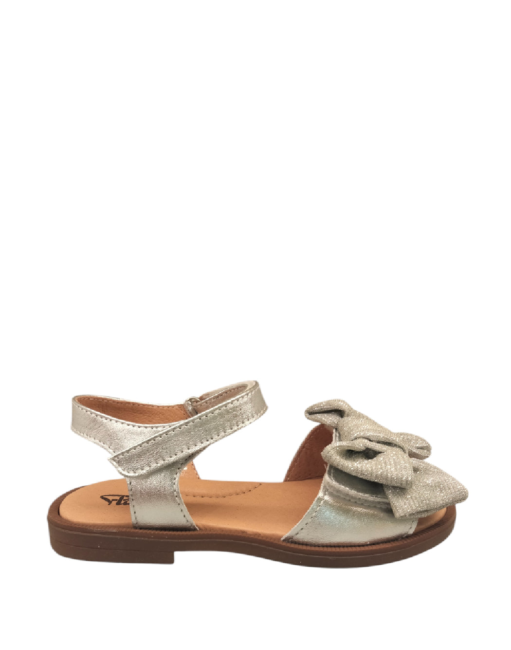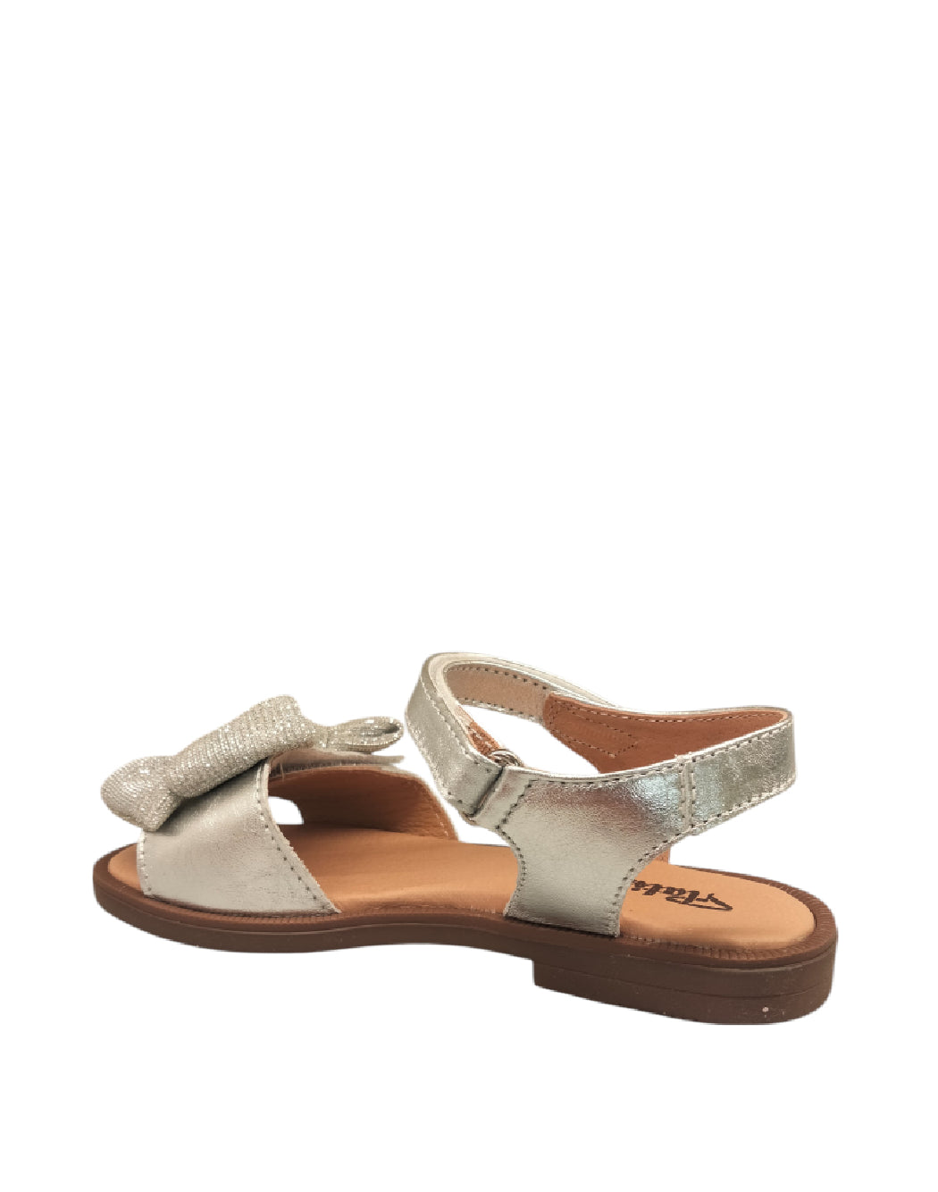 Sandalo da bimba color platino con fiocco in tinta laminato. Made in Grecia, con interno in pelle e sottopiede dotato di arco plantare. Fondo in gomma antiscivolo e chiusura regolabile con velcri.