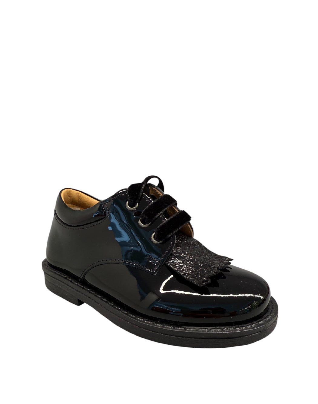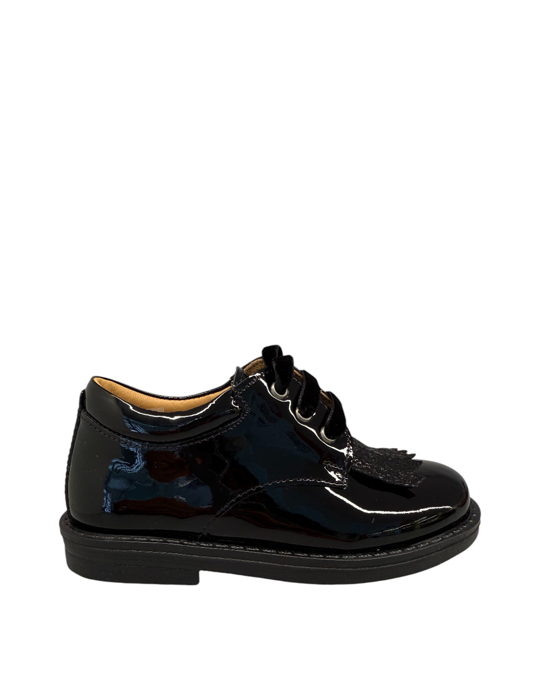 Scarpetta da bimba modello inglese, in vernice nera, con particolare frangia lavorata sul davanti. Chiusura con lacci in velluto in tinta. Interno in pelle.