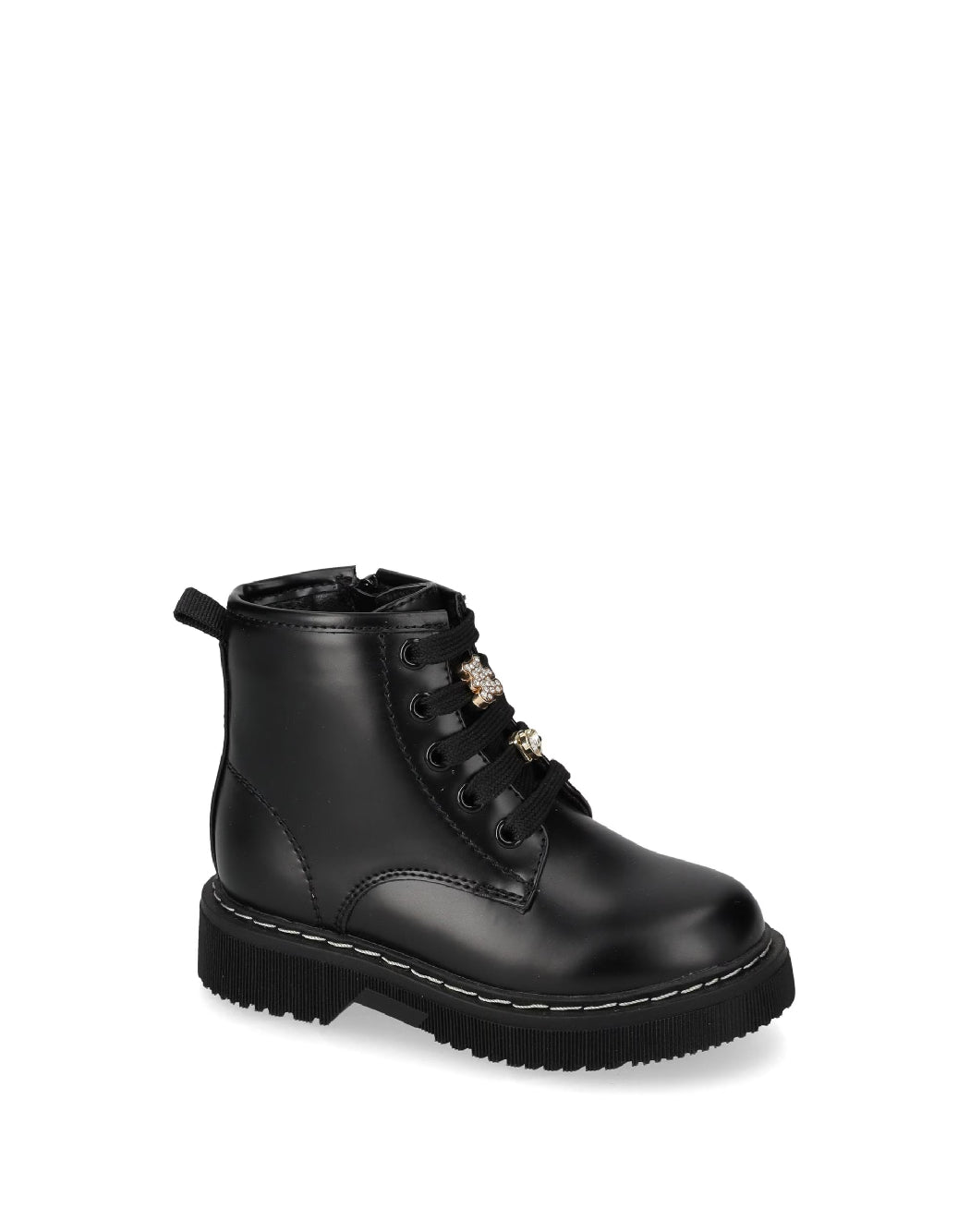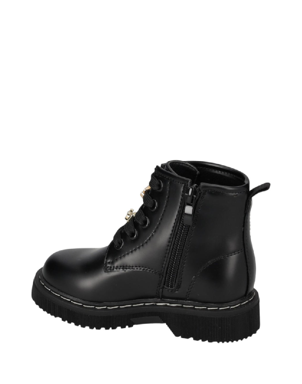 Tronchetto con tomaio in sintetico e sottopiede in pelle. Accessorio decorativo removibile. Chiusura con lacci e zip laterale.