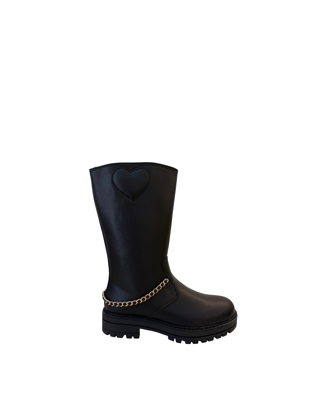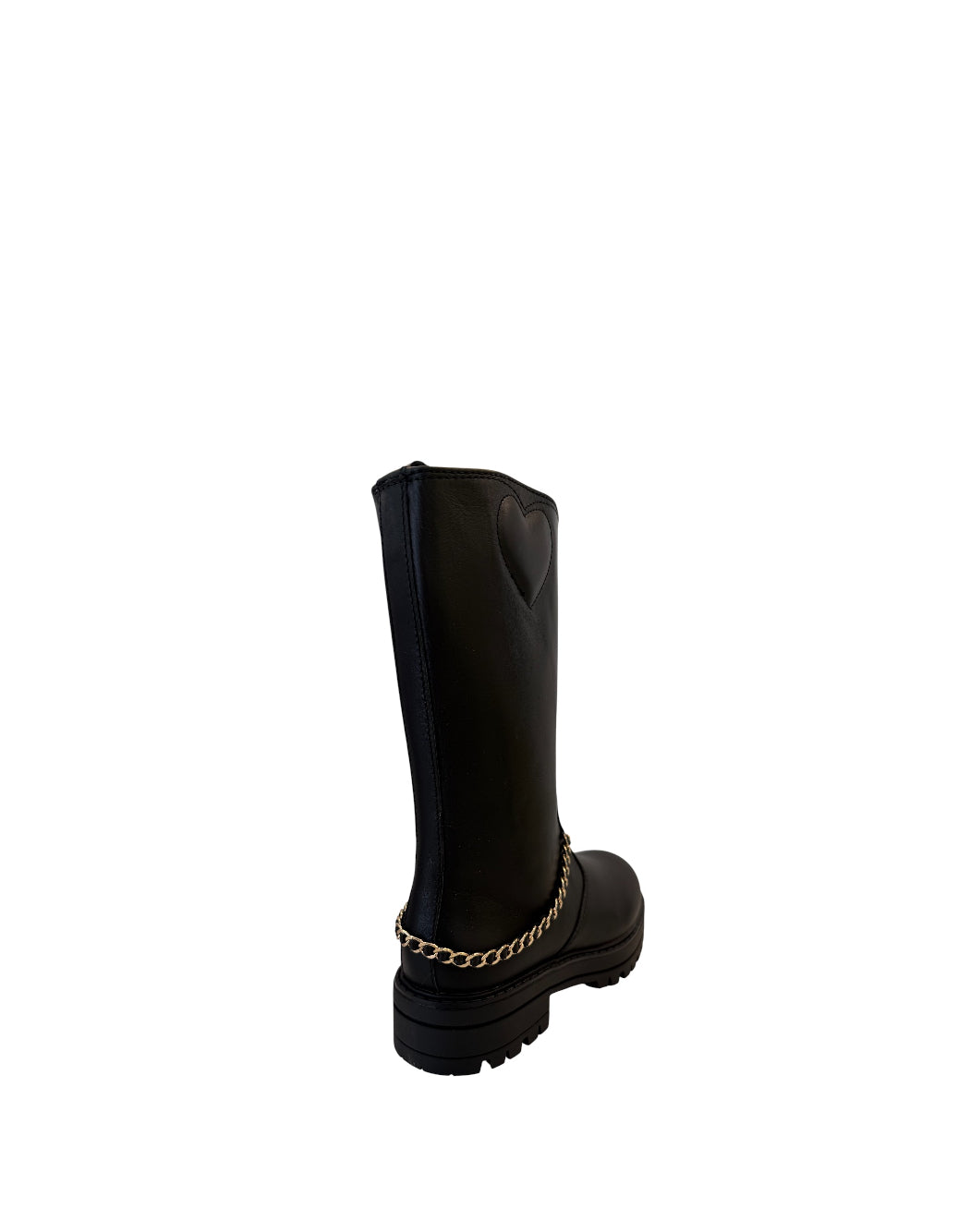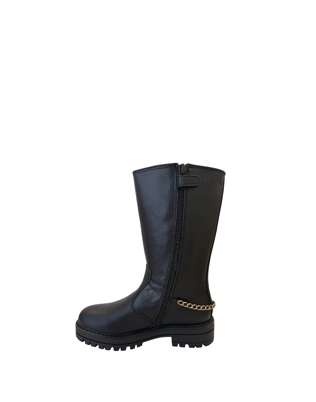 Stivale alto in pelle nero impreziosito da una catenina sottile color oro sulla parte posteriore della calzatura. Interno in pelle e chiusura con cerniera laterale.st