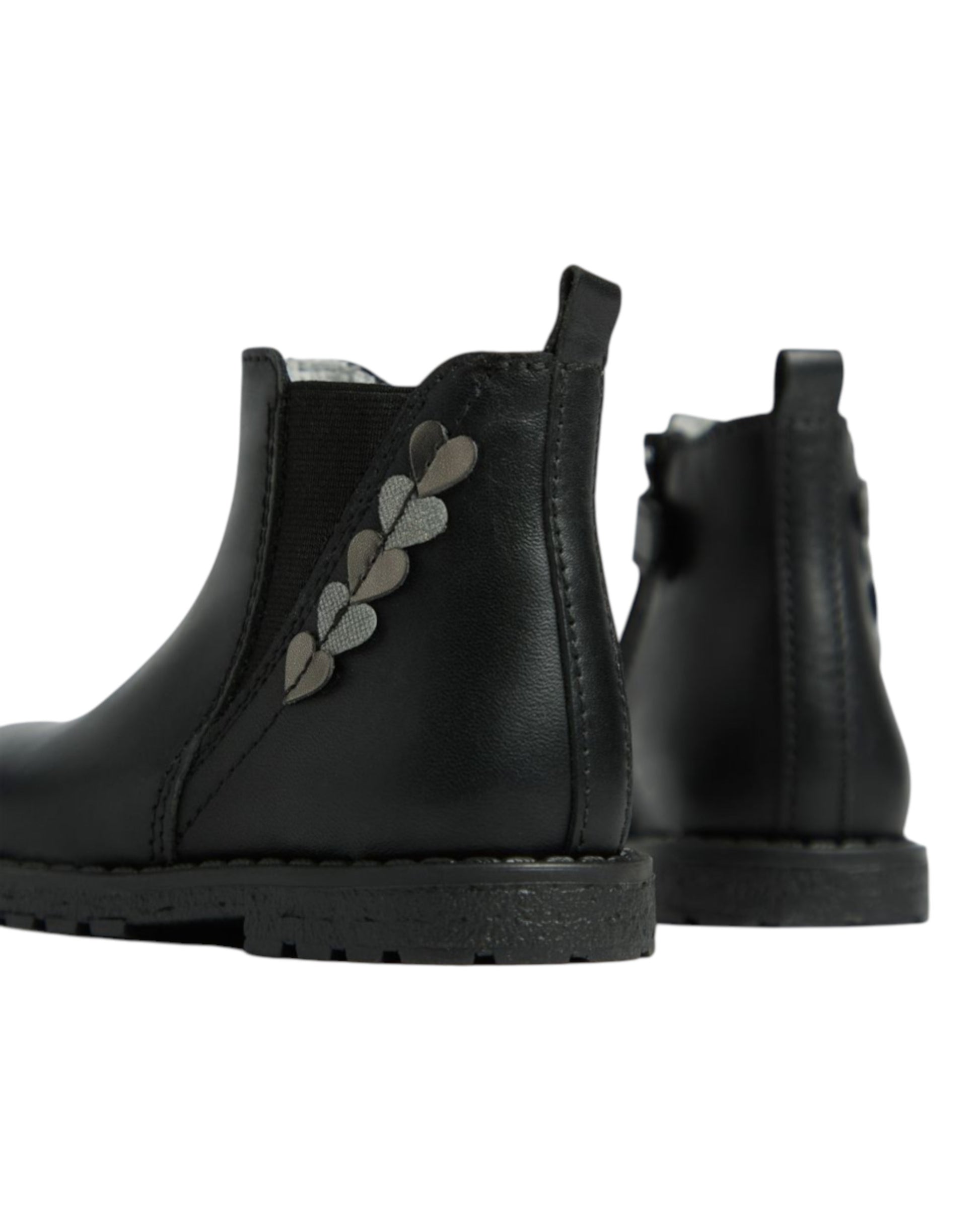 Modello beatles con elastico in tinta, cuoricini decorativi e zip laterale.