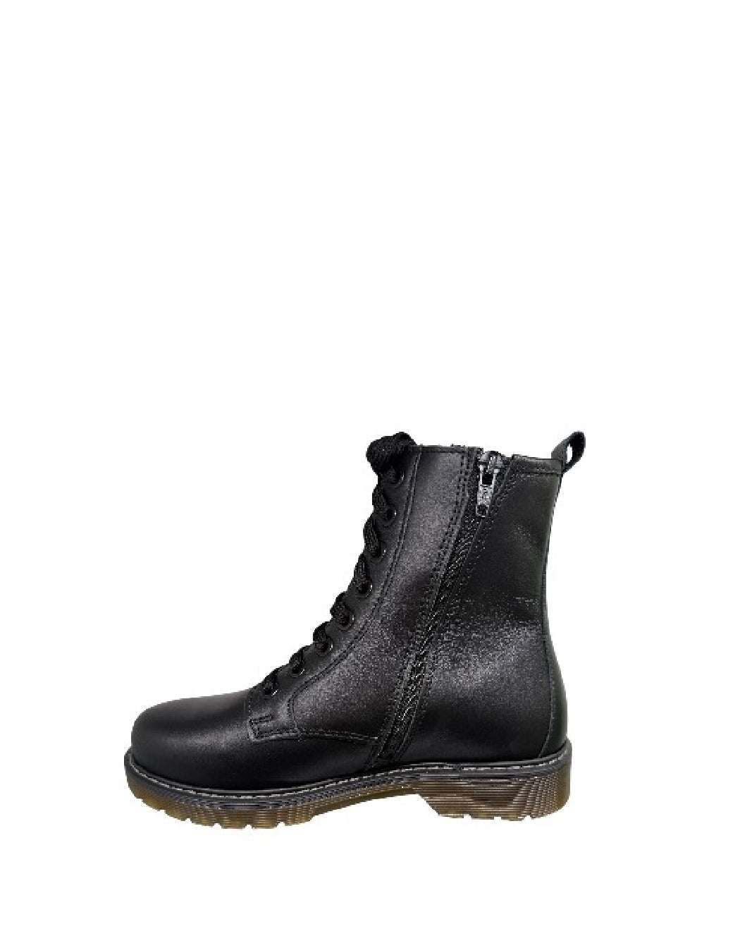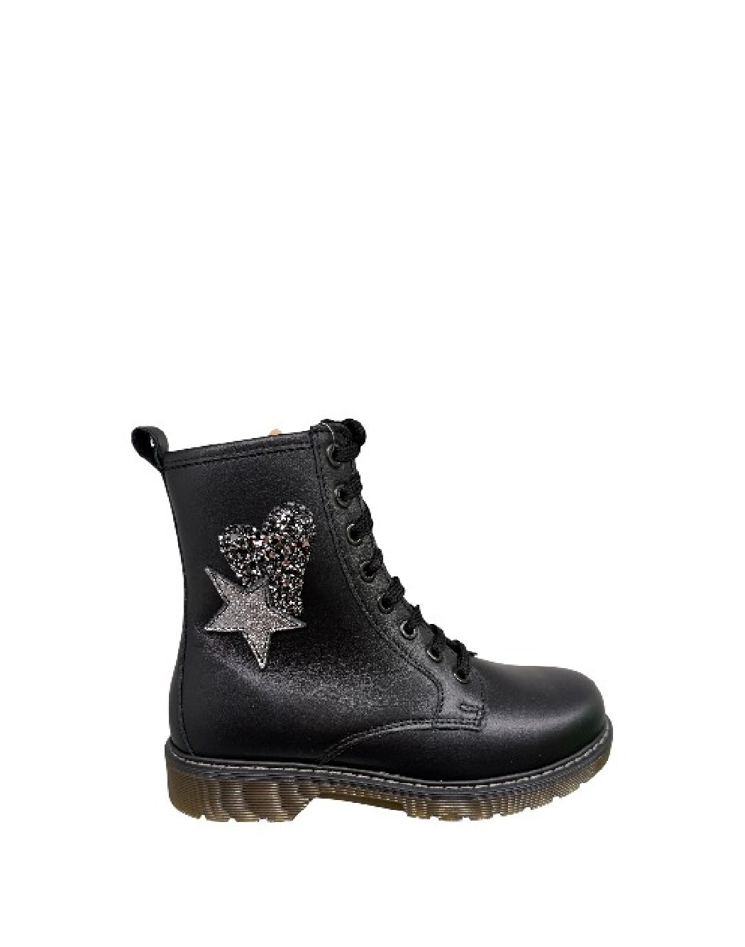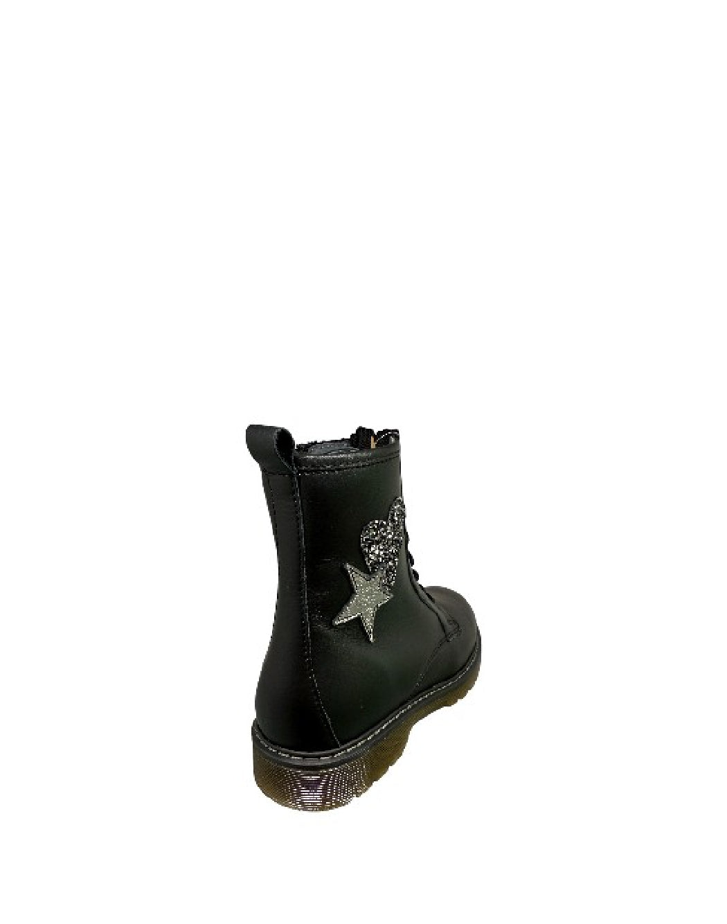 Anfibio invernale dal design minimalista e chic, linee pulite e dettagli discreti. Perfetti per le occasioni più eleganti, gli anfibi sono realizzati con materiali di alta qualità e dotati di una suola più spessa per garantire il massimo comfort anche nelle giornate più fredde. Tomaia in pelle nero con dettaglio laterale di un cuore glitter ed una stella. Chiusura comoda con lacci e zip laterale.