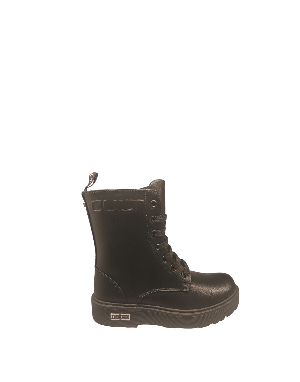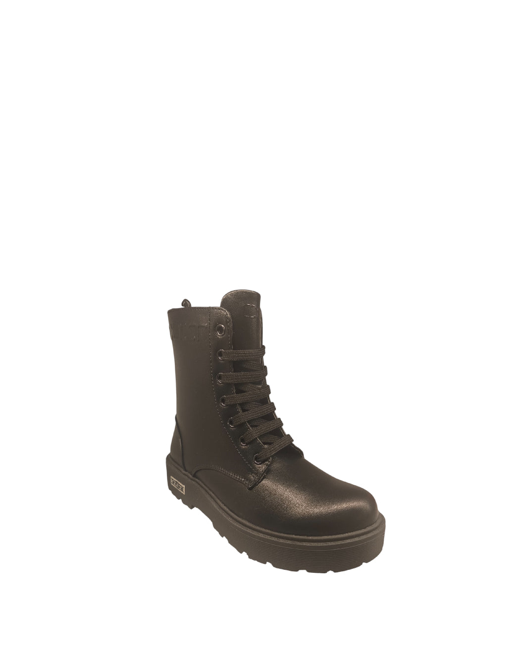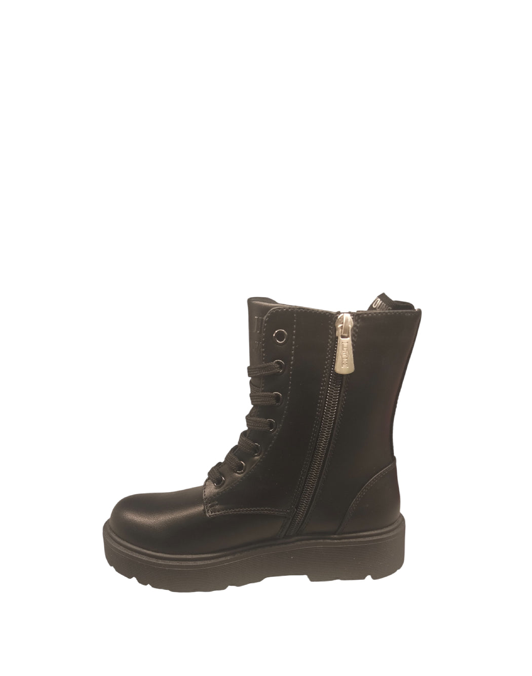 Anfibio da bimba/ragazza/mamma. Similpelle nero, chiusura comoda con lacci e cerniera. Sulla parte laterale marchio stampato in tinta.